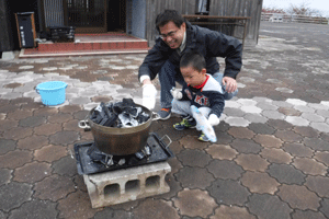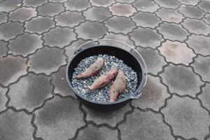 燃料は炭。ダッチオーブンを使って「石焼きいも」を作りました。