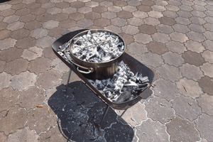 燃料は炭と焚き木。ダッチオーブンを使って「香ばしいピザ」やデザートの「コブラー」を作ったよ。