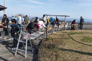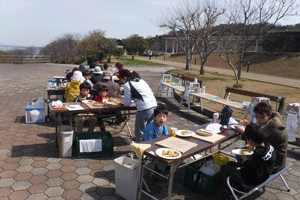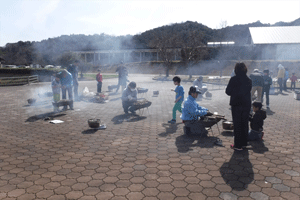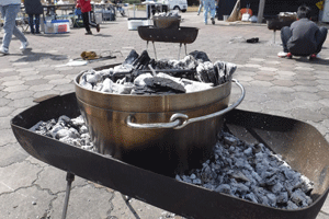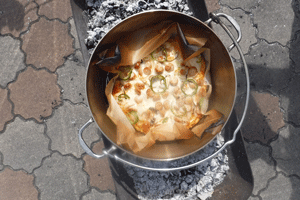 燃料は炭と焚き木。ダッチオーブンを使って「香ばしいピザ」やデザートの「あま〜いコブラー」を調理しました。