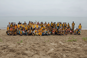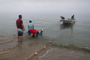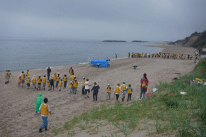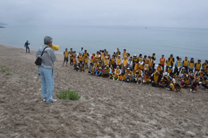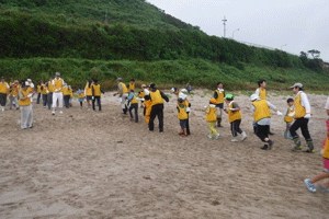 みんなで海岸清掃をした後、東と西に分かれて網を引いたよ。