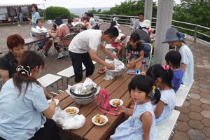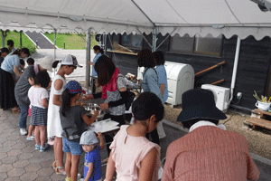 家族で協力しながら竹をまわしてバームクーヘンを作ったよ!