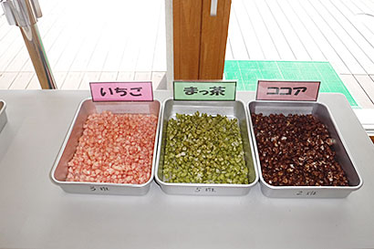 オーブンで焼いたおもちに、苺パウダー・ココア・青のり・ゆかり・カレー・まっ茶で味付けをして、カラフルでおいしいひなあられができたよ!