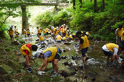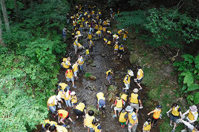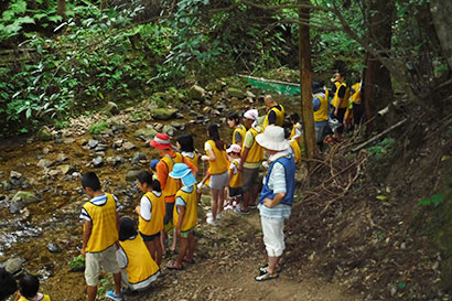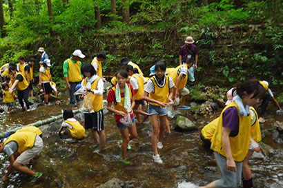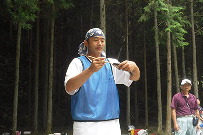 奥田儀の宮本川上流で、田儀櫻井家のたたら製鉄について学んだ後、いよいよヤマメのつかみどりに挑戦!