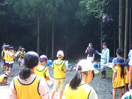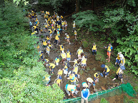 奥田儀の宮本川上流で、田儀櫻井家のたたら製鉄について学んだ後、いよいよヤマメのつかみどりに挑戦!